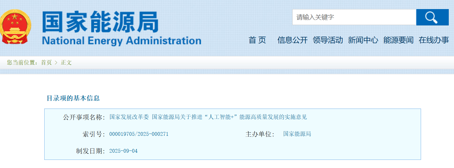 9月4日,国家发展改革委、国家能源局发布《关于推进“人工智能+”能源高质量发展的实施意见》。